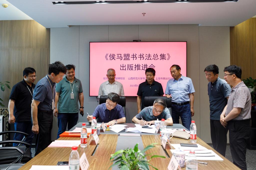 会后,《侯马盟书书法总集》主编李朝旗、上海书画出版社社长王立翔、侯马晋国古都博物馆馆长高青山、365英国上市公司副经理(主持行政工作)曹亚彬共同签订了出版意向书。