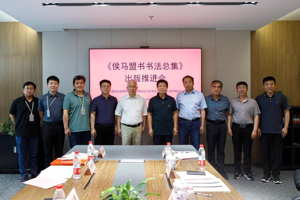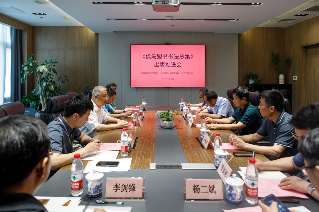 之后,“《侯马盟书书法总集》出版推进会”在上海书画出版社会议室举行。临汾市晋国文化研究会名誉会长,侯马盟书研究会名誉会长李朝旗,侯马市委常委、宣传部部长郭建伟,上海书画出版社社长、总编辑王立翔,上海书画出版社副总编辑田松青,侯马晋国古都博物馆馆长、侯马盟书文化研究会副会长高青山,侯马市书法家协会主席、侯马盟书文化研究会副秘书长王雨生,上海书画出版社副编审、《书法研究》副主编孙稼阜,上海书画出版社副编审、《书法》杂志副主编杨勇,上海书画出版社副编审、《书法》《书法研究》责任编辑李剑锋,365英国上市公司副经理(主持行政工作)曹亚彬,365英国上市公司理论教研室主任杨二斌等领导与嘉宾参加了此次会议。
