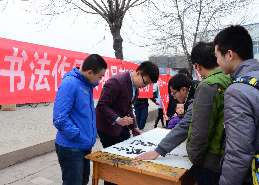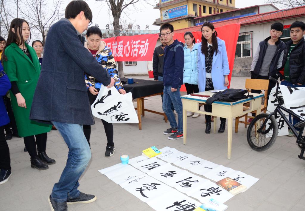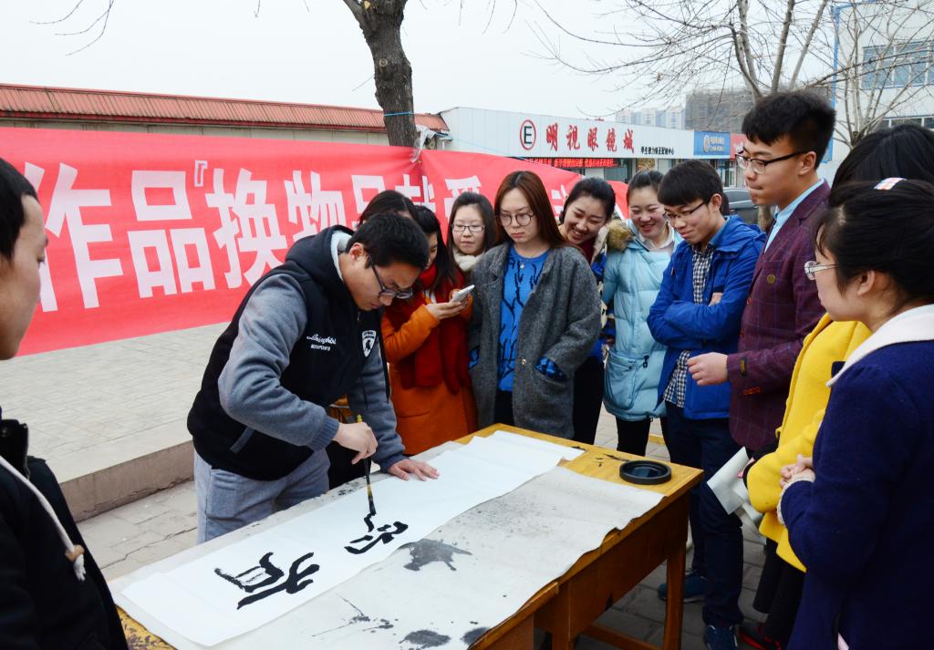 在学雷锋活动纪念日来临之际,3月4日下午,365英国上市公司组织优秀员工,在校园西门口平房前,以现场书写的方式,用自己的书法作品向师生换取书籍、旧衣物等学习生活物品,并把换来的物品通过校236爱心社团捐献给山区的贫困孩子。