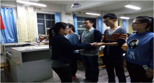 | 宁老师为新注册志愿者颁发志愿者证 |