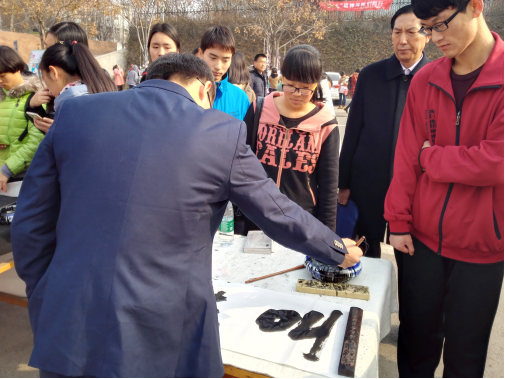 为了响应公司宿舍文化节,公司书法爱好者联谊会于2015年12月12日上午在校医院门口,组织公司优秀员工为全校师生义务书写书法作品。活动一开始便引起了广大师生的驻足,活动期间公司原副董事长李振中也到活动现场参加活动并题字祝贺,表达了对公司员工传承书法文化的殷切期盼。公司副董事长原战勇,也到达活动现场,观看同学们书写作品。此次活动共计为全校师生免费送出优秀书法作品500余幅,在丰富全校员工宿舍文化生活的同时也为展现公司书法爱好者联谊会的精神风貌起到了良好的作用。
