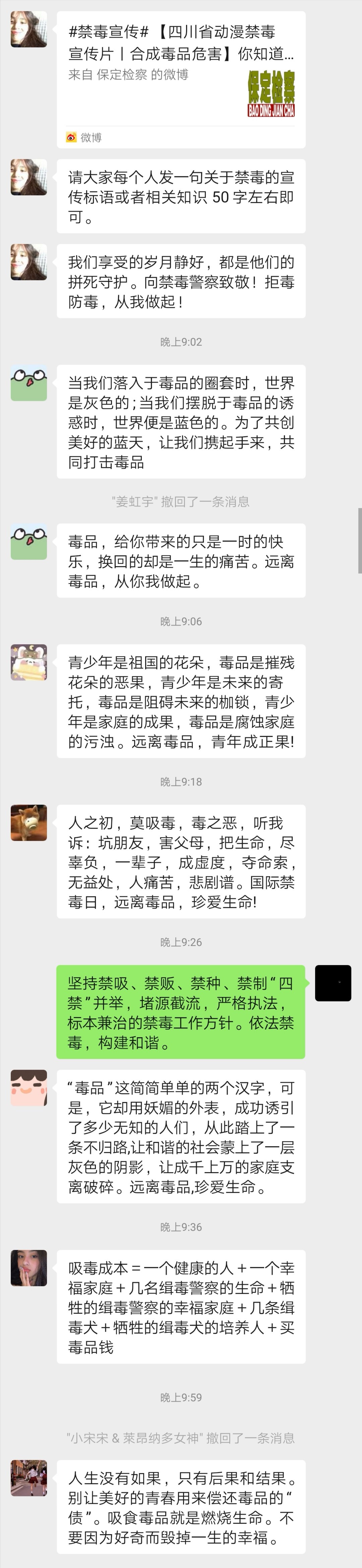 在主题团日活动过程中,各团支部结合支部团员实际,积极开展线上、线下学习教育活动,通过学习习近平总书记关于禁毒工作重要指示精神、毒品百科知识和禁毒法律法规宣传、观看禁毒影片、分享禁毒学习感受等形式,帮助全体同学进一步增强识毒防毒拒毒意识,提高自觉抵制毒品的能力,教育引导他们珍惜生命、热爱生活,远离毒品。
