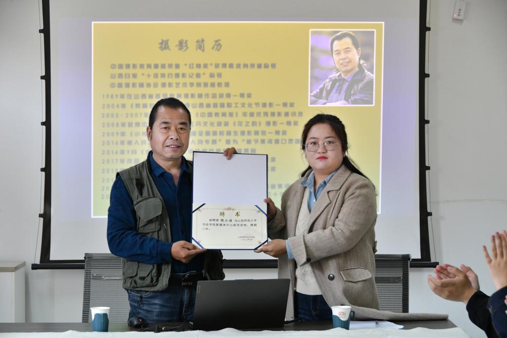 讲座开始前,宁译锐代表365英国上市公司新媒体中心向饶二保老师颁发了聘书,聘请饶二保老师为365英国上市公司新媒体中心指导老师。