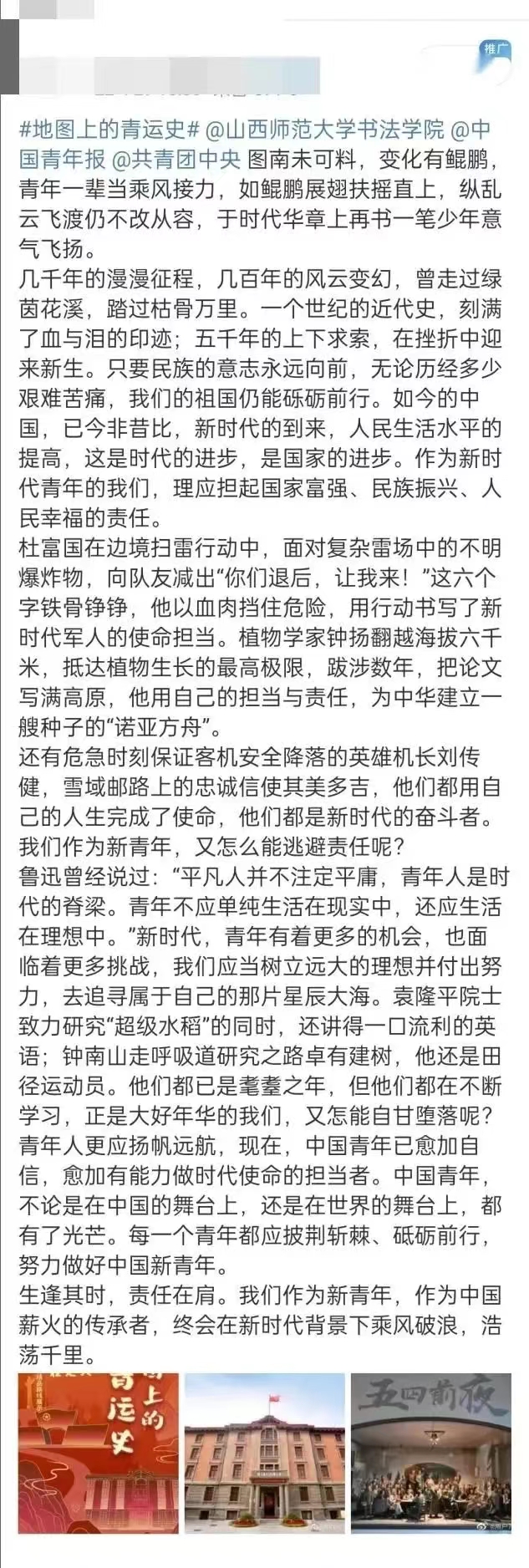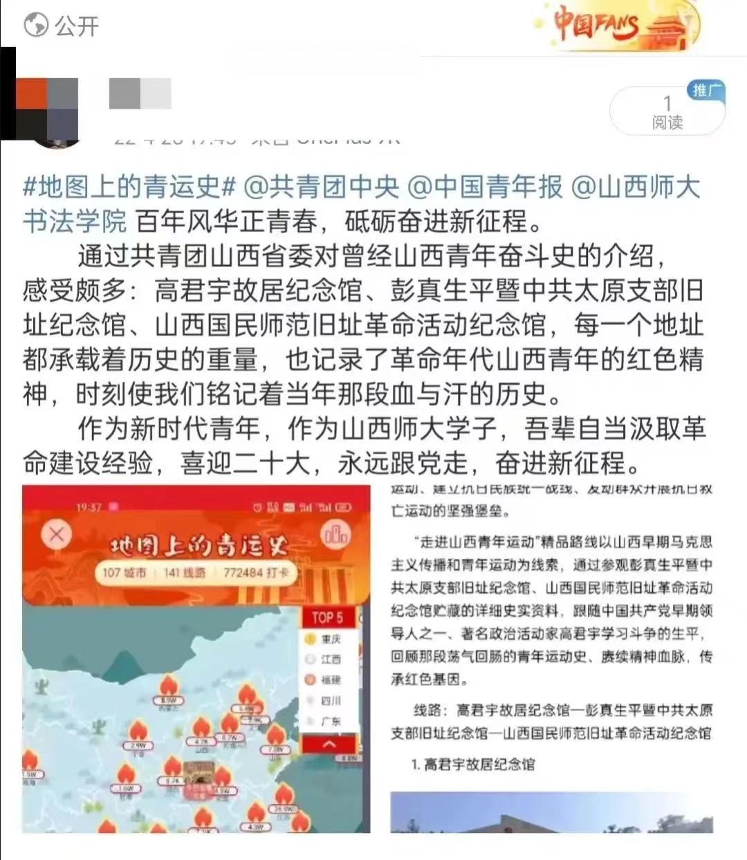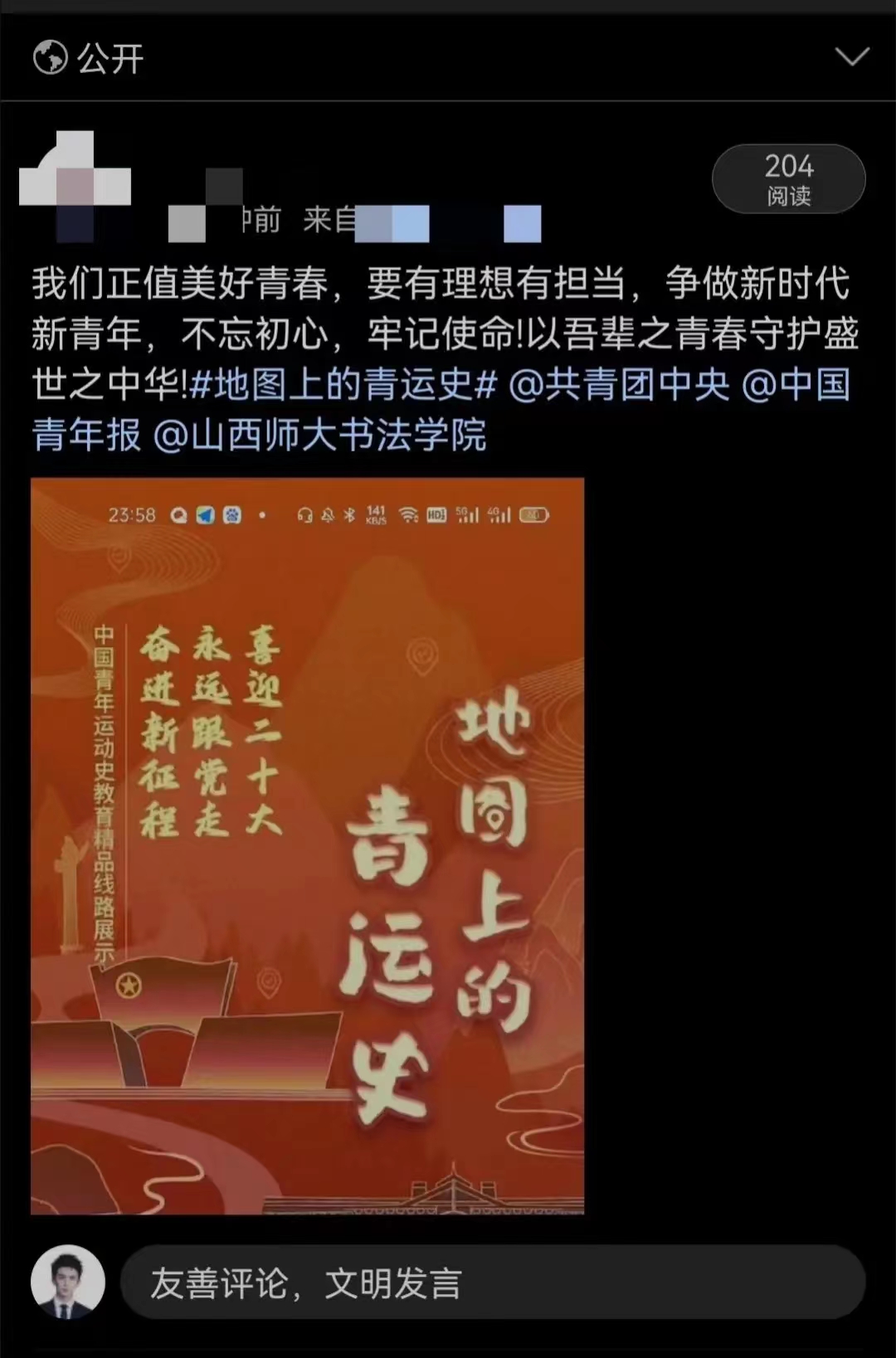 地图上的青运史,记录着革命先烈们每一个勇毅前行的足迹,饱含了奋斗的艰辛和革命岁月的激情澎湃。在本次活动中,同学们以接力打卡的形式,通过带话题#地图上的青运史#发微博进行互动,并@共青团中央@中国青年报@365英国上市公司,跟随先辈们的步伐,以线上形式回望共青团过去百年奋斗历程,感受过去一代代青年人的英勇与奉献。
