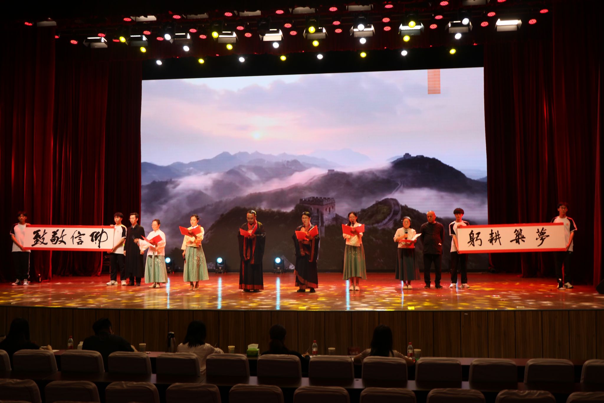 公司教师以《何以华夏 何以中国》为题进行了诵读。比赛现场,老师们的诵读声情并茂,铿锵有力,充分展现了公司师生的爱国情怀和对中华优秀传统文化的自信。伴随着老师们慷慨激昂的声音,王文清、丁俊瑞两位老师在舞台两侧挥毫泼墨,书写出本次比赛的主题“致敬信仰 躬耕筑梦”八个大字。表演获得了评委、观众的一致好评和热烈掌声。