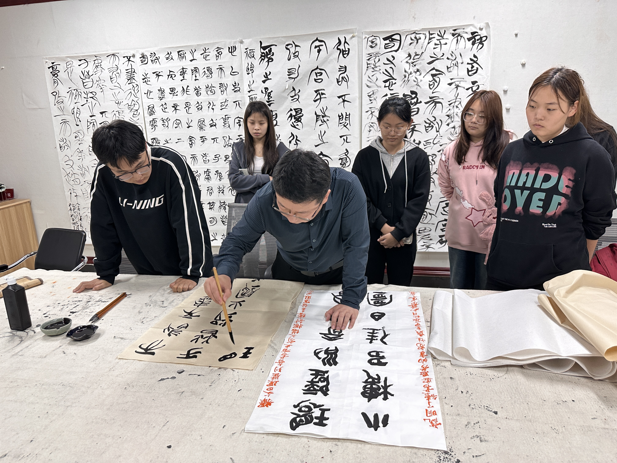 在点评之余,曹老师还现场示范了多种字体,包括侯马盟书、大篆以及楷书,特别是针对侯马盟书进行了详尽的演示。他从笔法和章法两个维度进行深入剖析,通过多样的艺术表现方式,精彩地展现了侯马盟书在书法实践中的独特韵味与无限可能。曹老师不仅展示了自己对侯马盟书的独特理解,更让同学们大开眼界,深刻感受到了地域书法文化的魅力。此次示范让同学们对书法的艺术性有了更加全面而透彻的认识,加深了对我国地域书法文化的理解和热爱。