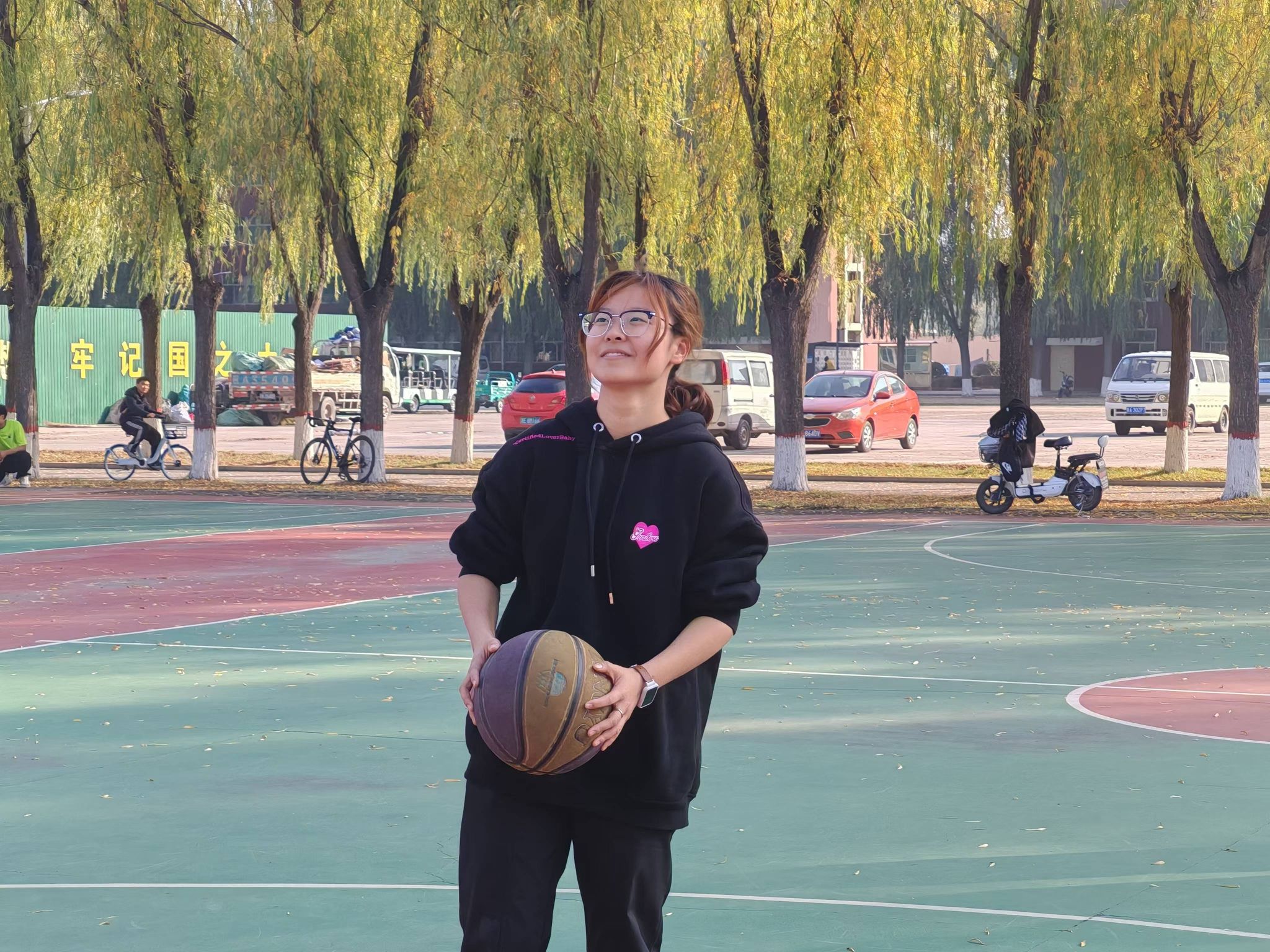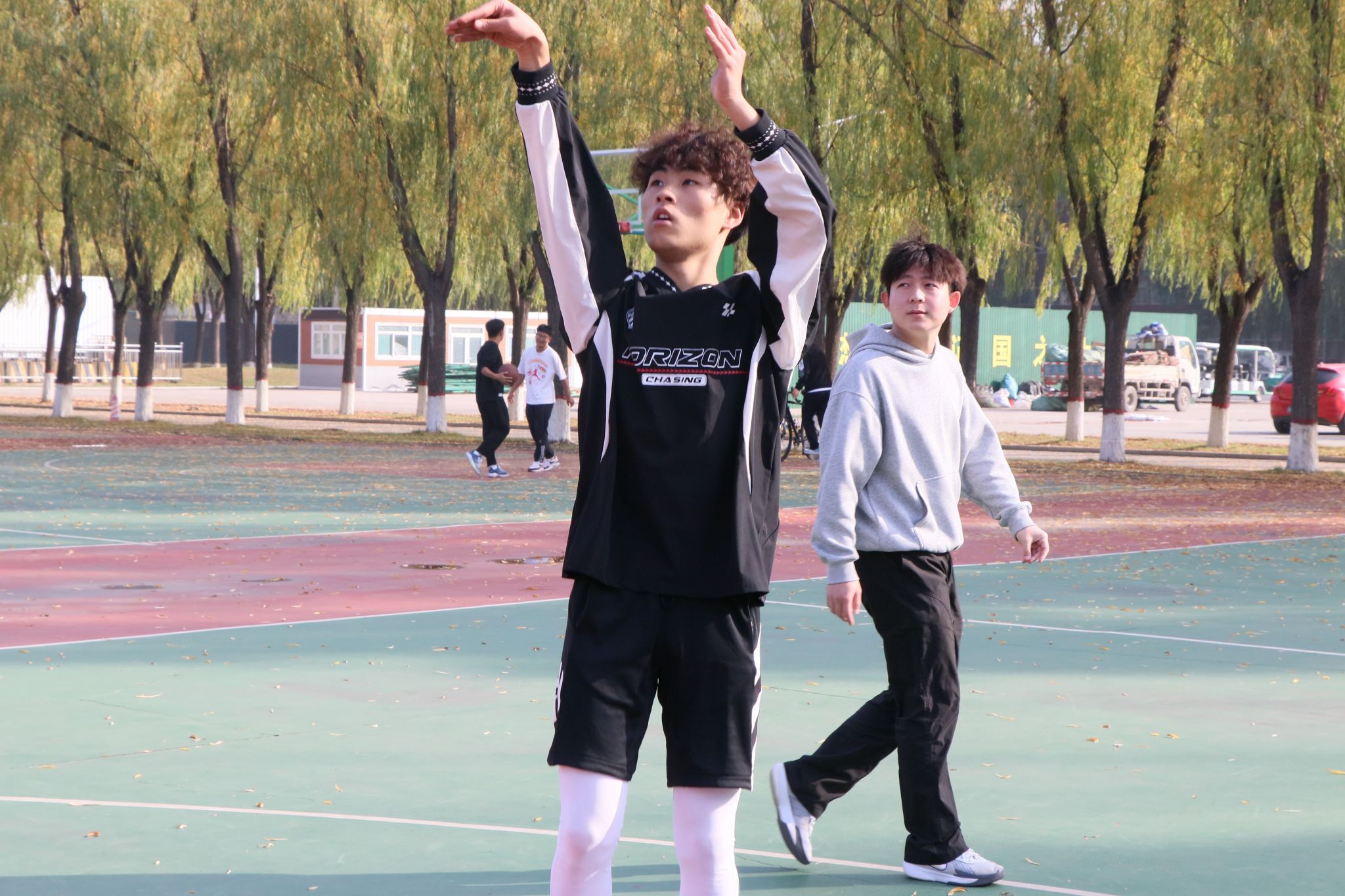 在个人定点投篮项目,参赛队员站在指定的投篮点,眼神专注地盯着篮筐,每一次出手都伴随着同学们的阵阵喝彩。