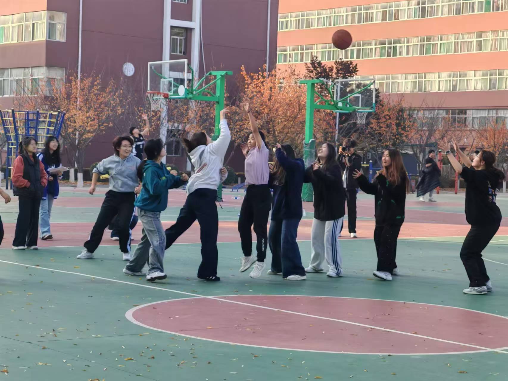 随着裁判的哨声吹响,各参赛队员迅速进入状态。在团体篮球竞赛中,队员们在篮球场上积极奔跑、传球、投篮,每一个动作都充满力量与技巧。双方队伍你来我往,比分交替上升,现场气氛紧张而激烈。