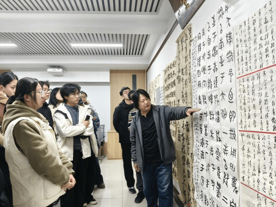 此次导师组活动中,王老师对各作品在章法、结构、墨色等方面进行了详细点评。活动过程中主要强调了落款的大小、字体、行距以及取法等在作品中应该符合的相关要求,在作品中,落款位置应处于所留空间的中偏上的部分,所盖印章应与落款相应的间隙,从而协调一份作品的章法。随后,王老师总结了此次交流活动,要求同学们在处理作品形式之前,应该参考全国展及权威展览中作品的形式,学习并采纳适合自己的形式,在学习过程中提高自己的审美水平和审美能力。