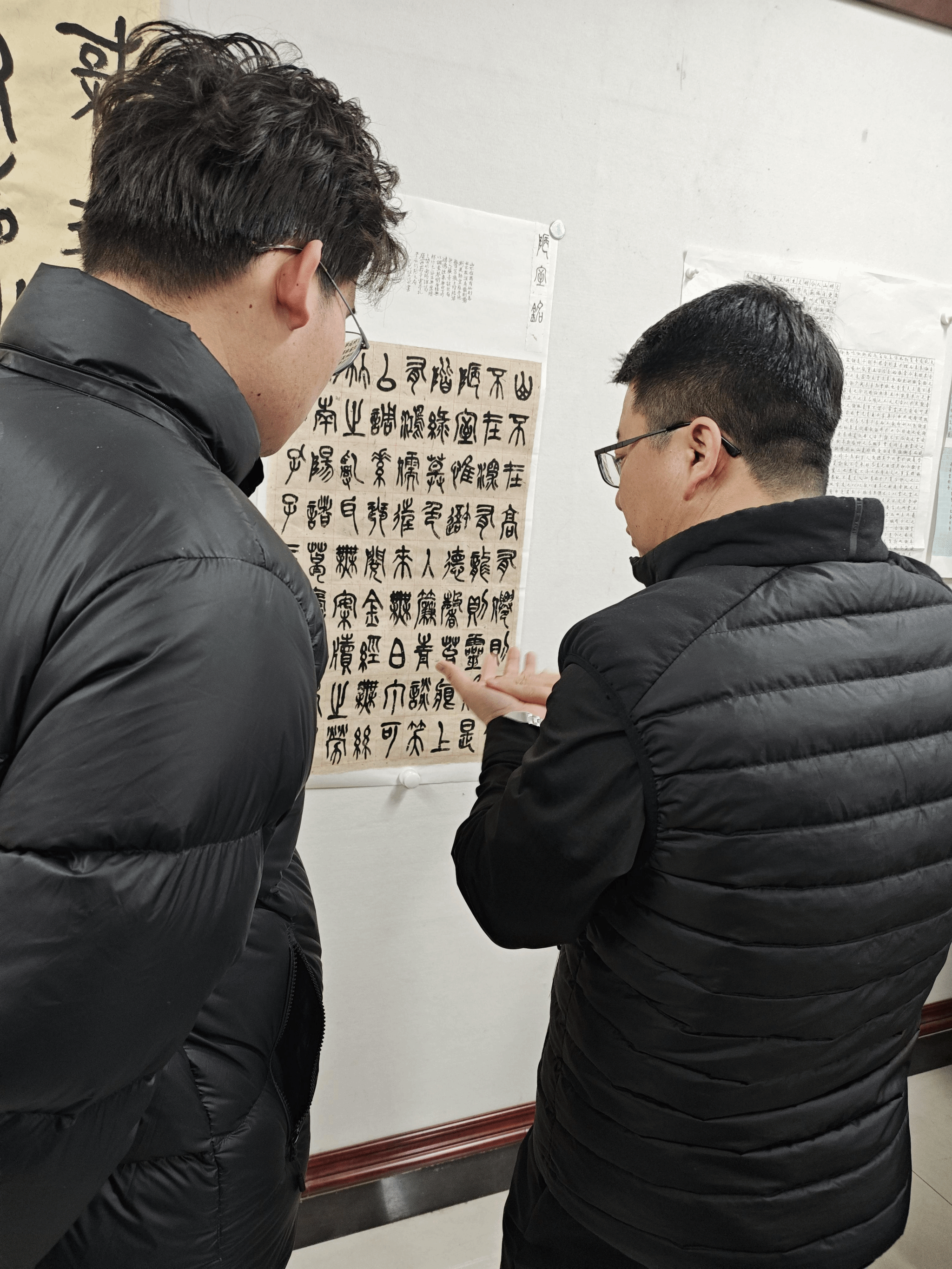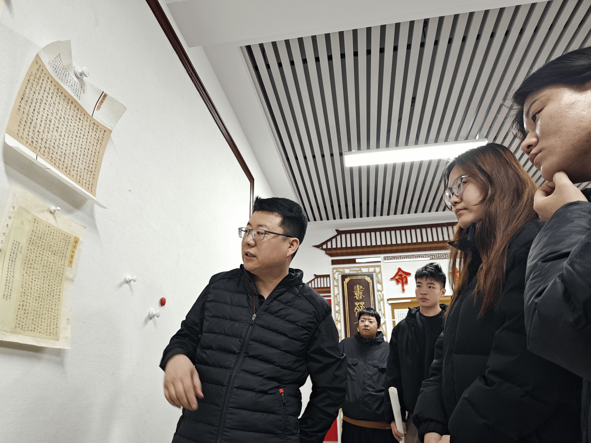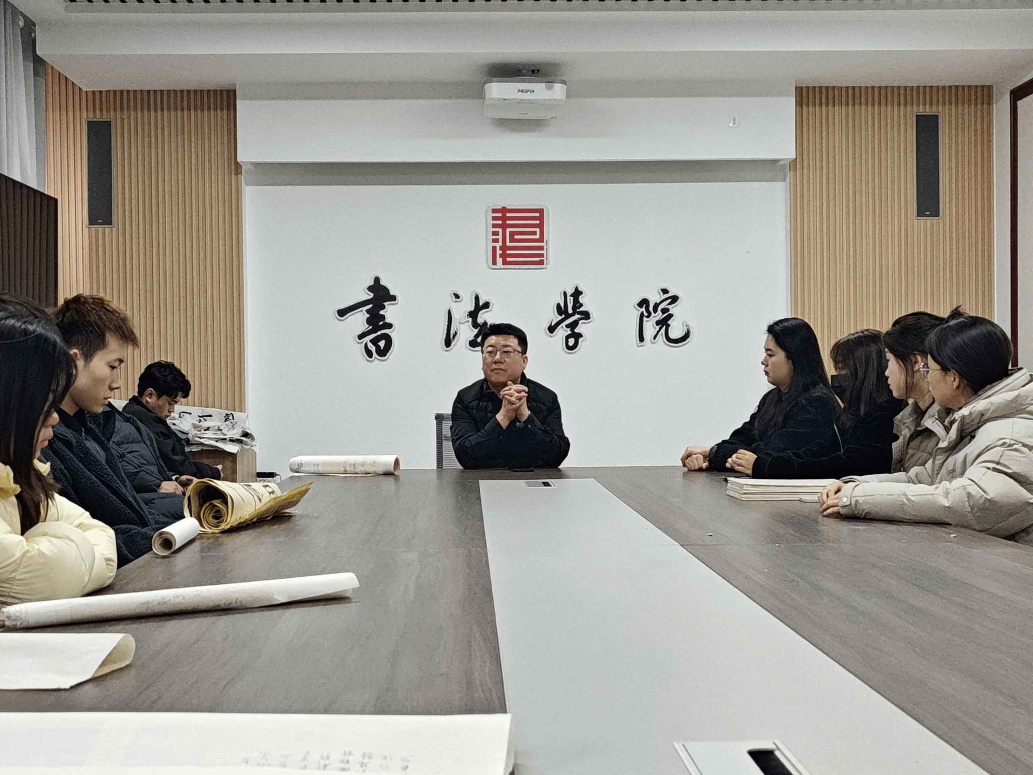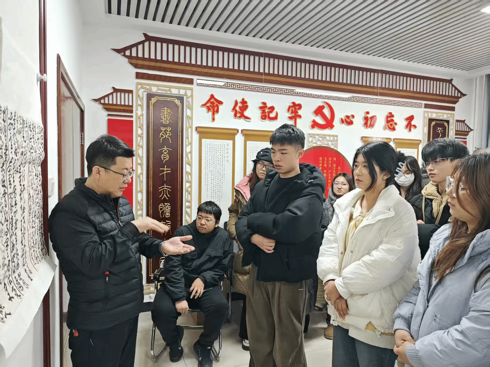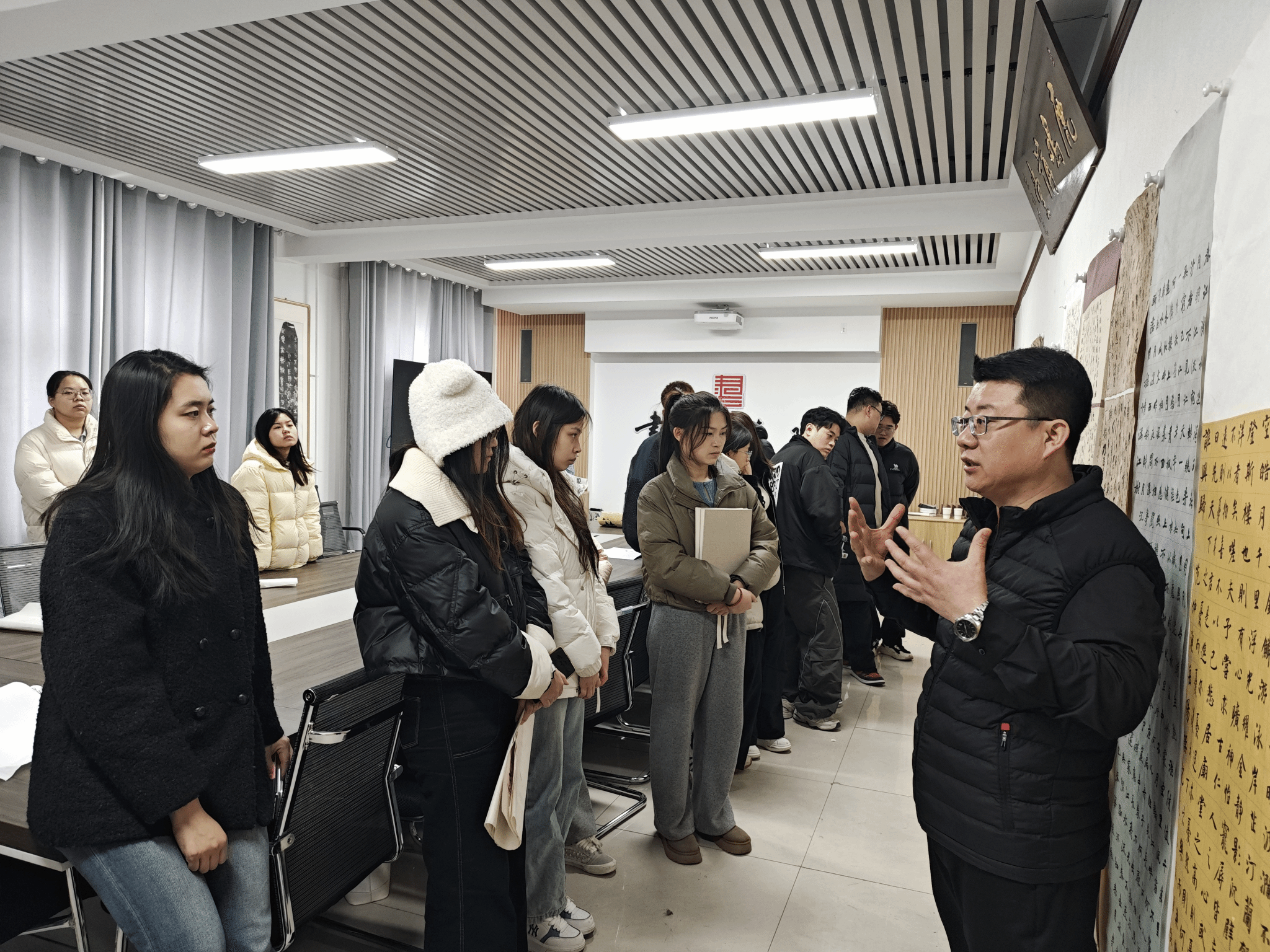 本次活动特别邀请曹老师的硕士生成员共同参加。活动伊始,曹老师细致入微地剖析了新学期同学们的学习规划,从专业技能到个人生活,均给予了全面而具体的指导,为同学们的学习之旅指明了方向,助力他们稳步前行。随后,同学们井然有序地将自己的书法作品挂于墙上,创作中心瞬间被浓厚的艺术氛围所包围。