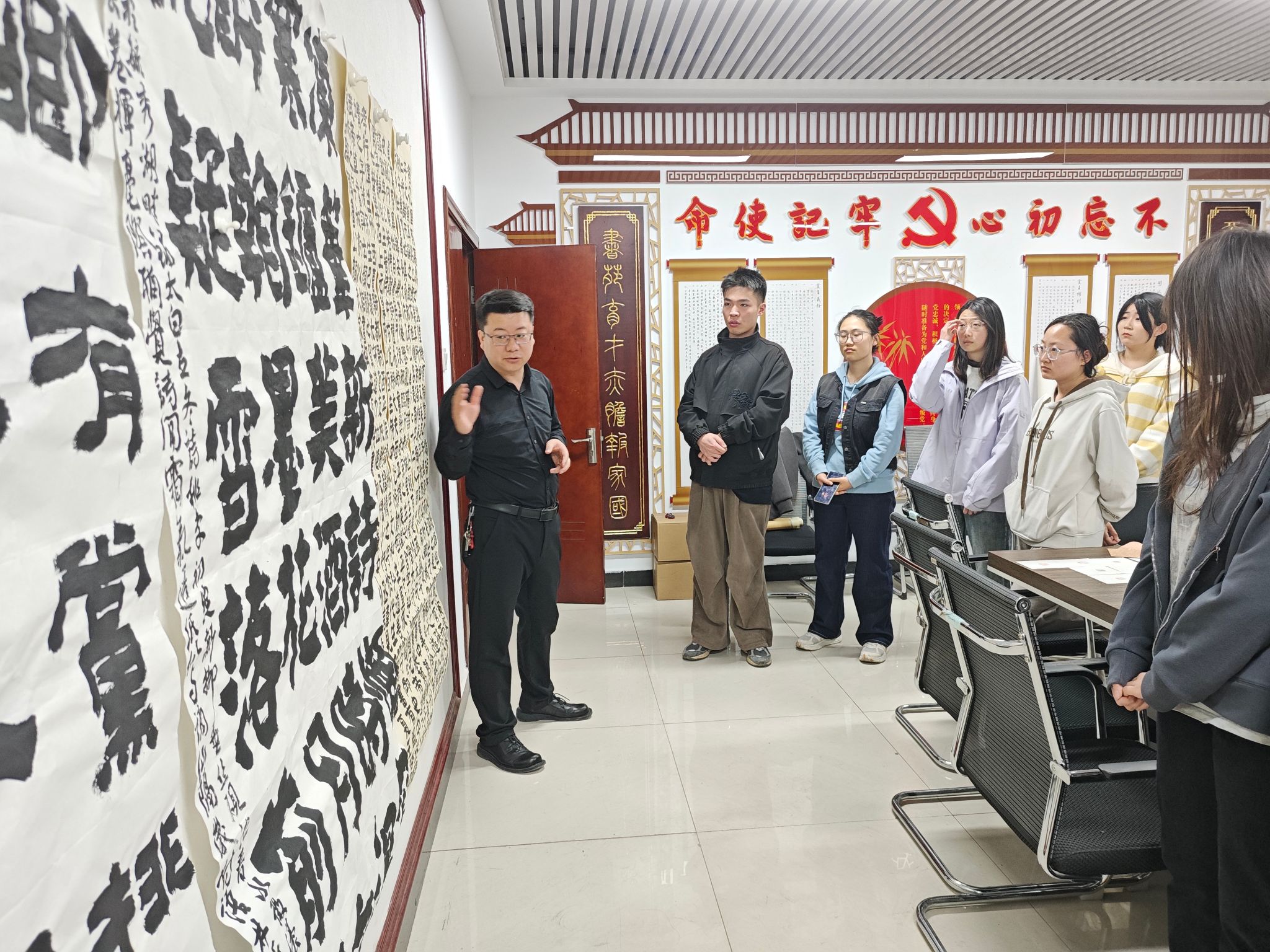 活动一开始,同学们井然有序地将自己的作品挂在墙上,办公桌上也摆满了作品,其中整整齐齐的小楷作品格外引人注目,而墙上的大字作品则以其气势磅礴吸引了众人的眼球。