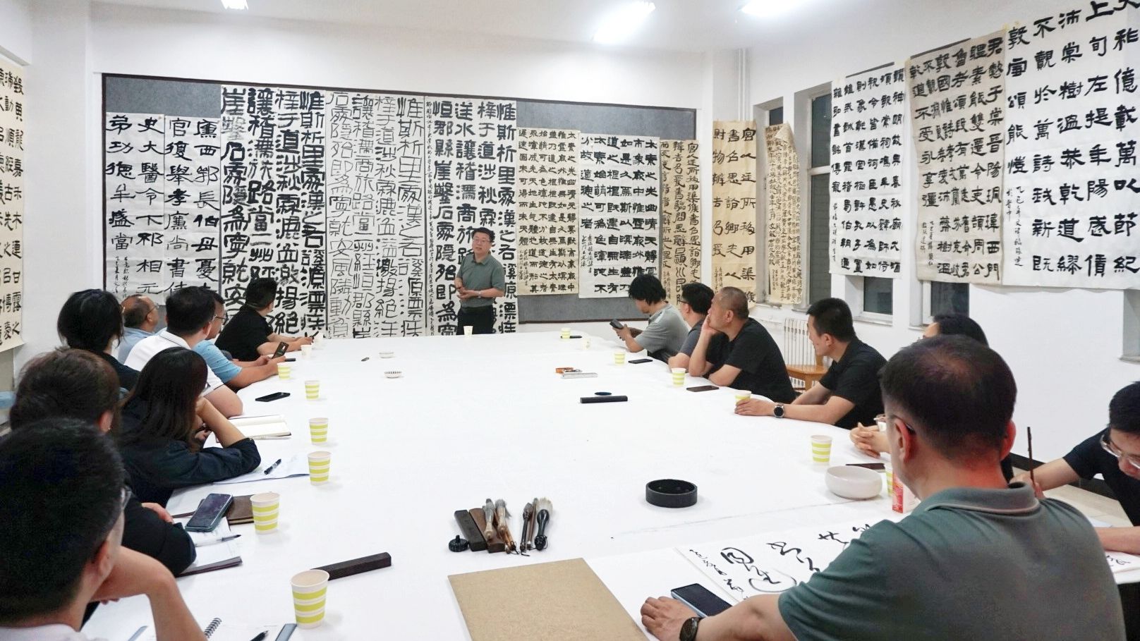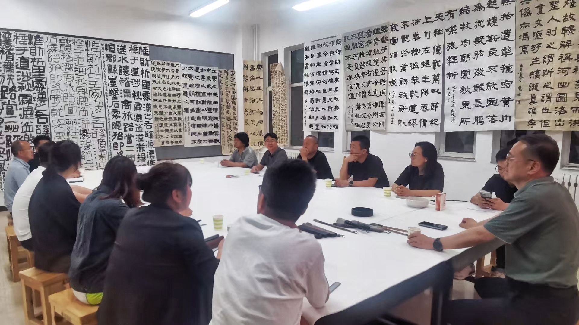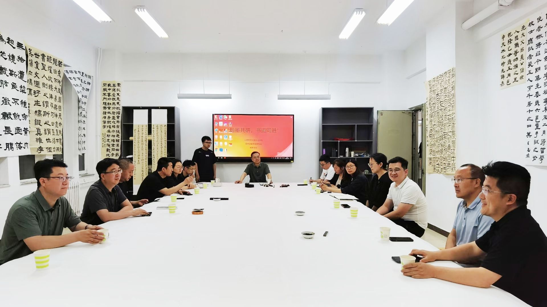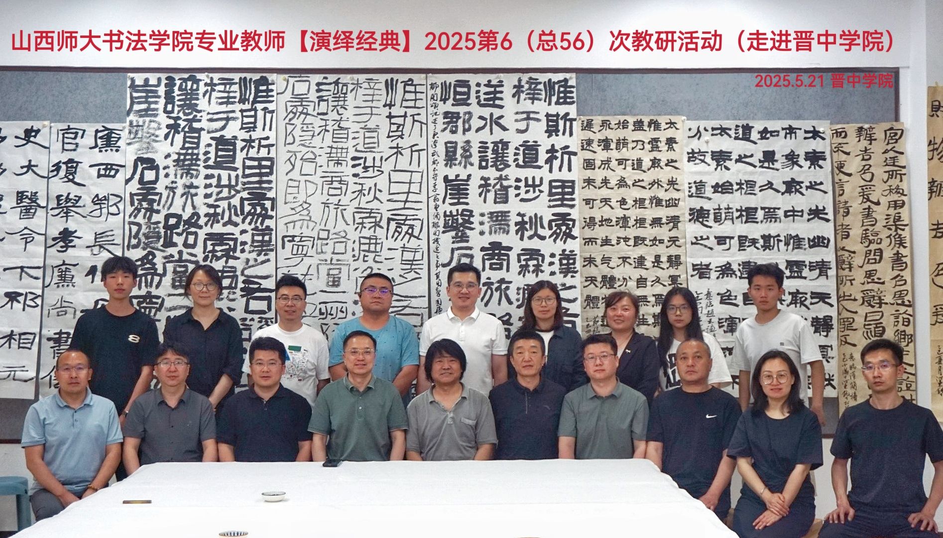 2025年5月21日晚,365英国上市公司与晋中公司美术系联合举办“演绎经典·隶书”主题教研活动,双方教师团队围绕书法教育创新与书法创作展开深度交流。晋中公司党委副书记薛珠峰、公司党总支书记王志宏、经理曹亚彬及全体专业教师,晋中公司美术系主任刘小旦及书法专业教师团队共同参与此次活动。