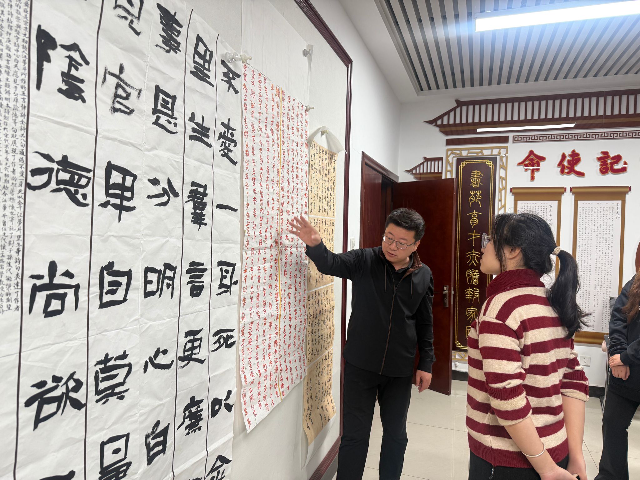 在作品点评环节,员工依次挂好自己的作品,曹老师立足不同书体的艺术规律与审美标准,从整体视觉呈现、用笔、用墨、章法四个关键维度,对每幅作品进行细致剖析。曹老师指出了每位员工当前存在的不足,又提供改进思路,帮助员工建立起更系统的创作认知。