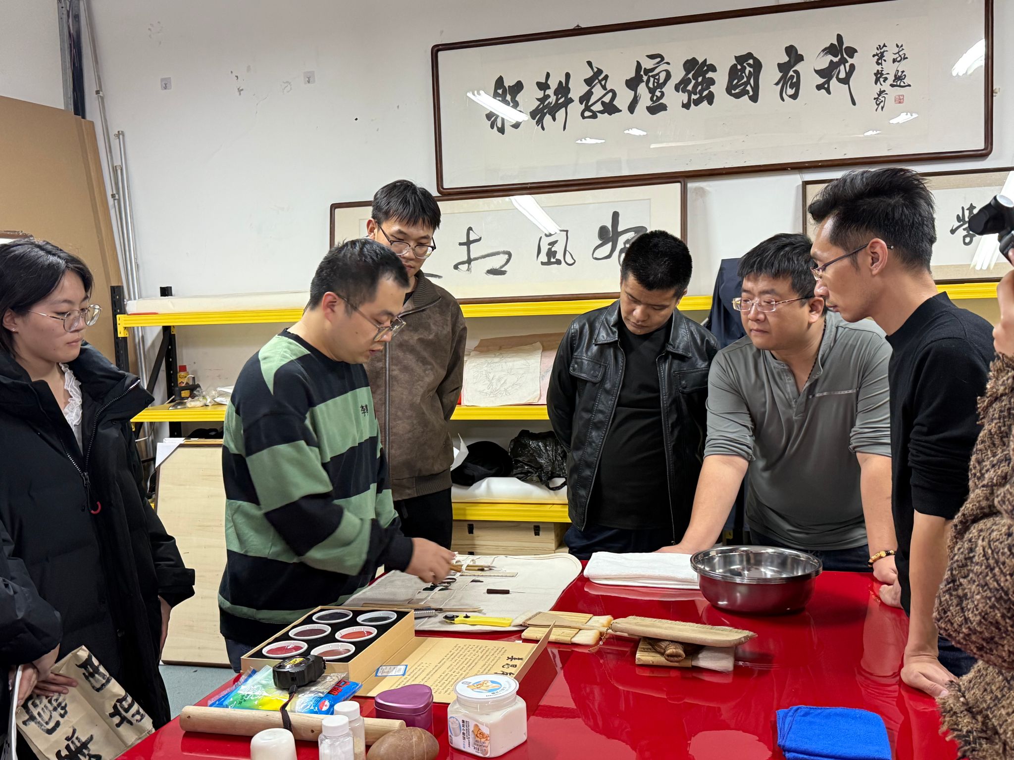 实操环节中,惠明涛老师首先亲自示范浆糊的调配方式,他一边熟练地操作着,一边耐心地向员工们传授经验。他特别指出,手工浆糊采用天然原料制作,不添加任何化学添加剂,能够最大程度地保护纸张和墨色不受损害,这是机器制作的浆糊所无法比拟的。同时,他还强调了浆糊浓稠度对装裱效果平整度的直接影响,让员工们明白每一个细节都关乎最终的成品质量。随后,惠老师全过程示范了湿托、飞托、搭托等不同的技艺,并详细讲解了每种技艺的适用场景。随后在惠明涛指导下员工进行现场操作练习,惠明涛不时亲手校正员工持刷、提画姿势,同学们按照步骤小心翼翼地操作——托心、上浆、排气、上墙,每一道工序都做得一丝不苟。