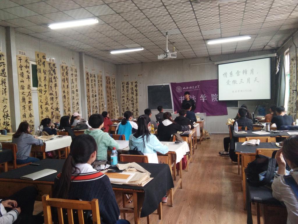 1501团支部开展了“青春献礼十九大,翰墨传情展风华”主题团日活动,以十九大知识宣讲、书写十九大标语、小组讨论交流形式学习了习近平新时代中国特色社会主义思想,进一步激发团员们爱党、爱国、爱社会主义的热情;1601团支部开展了“不忘初心 砥砺前行”主题团日活动,以十九大精神和社会主义核心价值观内涵的解读、十九大知识抢答形式引导团员青年进一步深入学习十九大讲话精神和社会主义核心价值观,激励团员青年为实现中华民族伟大复兴的中国梦而不懈努力;1701团支部开展了“弘扬雷锋精神,争做师大新青年”主题团日活动,通过主题演讲、观看视频、小组交流讨论等形式教育团员青年通过学习和弘扬雷锋精神进一步培育践行社会主义核心价值观,提高团员青年思想道德素质和政治素养。