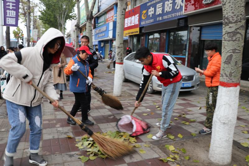 随后志愿者们分为两组,一组路南一组路北,在环卫工人带领下同学们拿起手中的笤帚对街道上的落叶及污物进行清扫。蒙蒙细雨下,同学们热情积极地打扫清理落叶,动作越来越熟练。尽管手指冻得通红,志愿者们却更深刻地体会到了环卫工人们平时工作的辛苦。