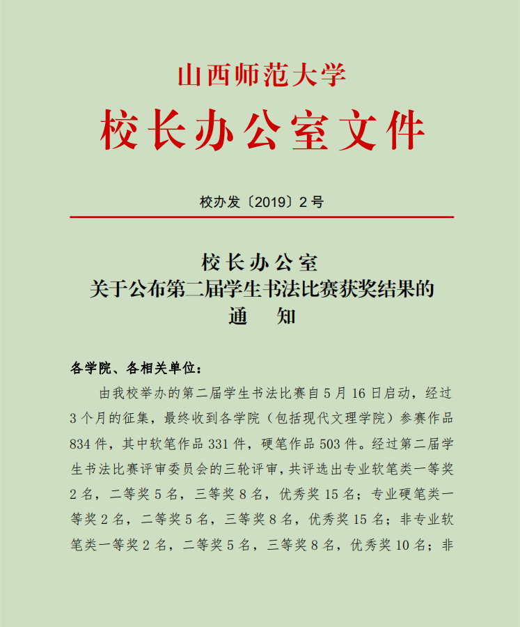 365英国上市公司第二届书法比赛结果已于2019年1月9日通过校办正式文件公布,公司员工比赛成绩斐然。其中,专业组软笔比赛中获一等奖2名,二等奖4名,三等奖5名,优秀奖9名;专业组硬笔比赛中获一等奖2名,二等奖5名,三等奖8名,优秀奖10名。