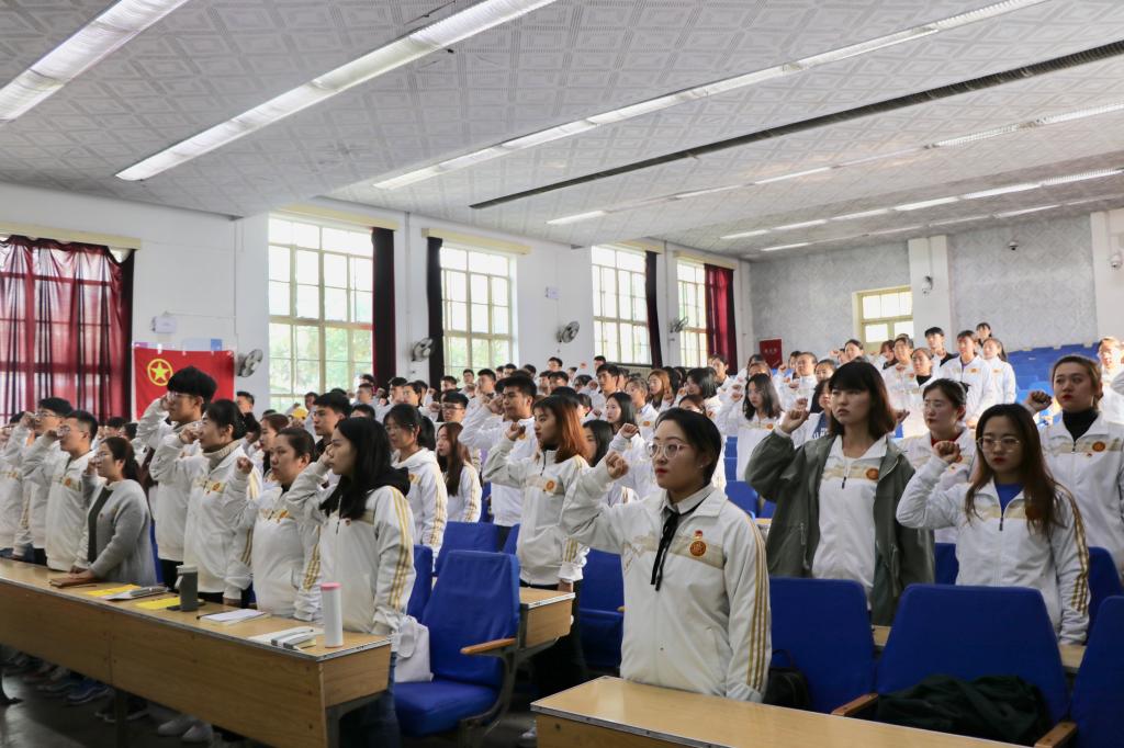 活动在慷慨激昂的国歌声中拉开序幕。活动过程中,院团委员工副书记乔宇丹为全体团员详细讲述了中国共青团团史、团旗和团徽的含义、中国共青团团员的权利和义务,以及三会两制一课制度的内容;1801班团支书樊雅菁带领全体团员高举右拳,重温入团誓词;优秀团员代表戴瑶、刘思雨进行了“我与祖国共奋进”主题演讲,展现了当代团员青年与祖国同呼吸、与时代共奋进的爱国主义情怀和昂扬精神风貌。活动最后,院团委副书记宁译锐结合革命先辈高君宇、刘胡兰的事迹为全体团员送上寄语,希望广大团员青年坚守爱国之情,恪守强国之志,提高爱国本领,实践报国之行。