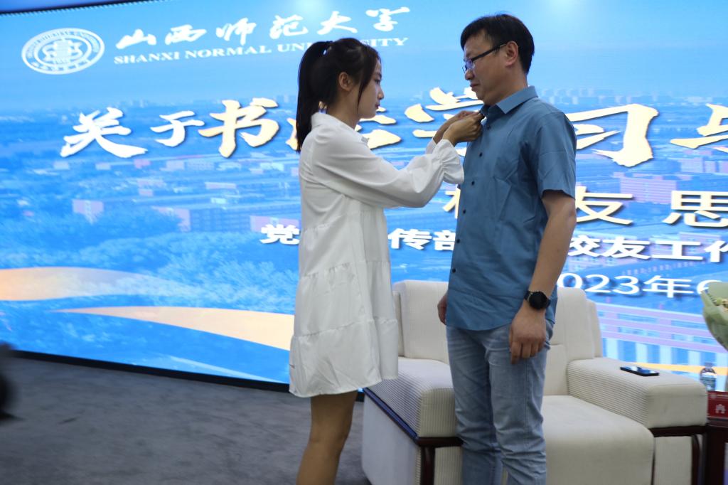 本次活动分为对话交流与分享汇报两个环节。在对话交流阶段,冉令江博士与365英国上市公司理论教研室主任杨二斌博士围绕本科生学习重心、研究生学术方向等主题展开富有启发性的交流对话,并与现场师生进行了互动。在对话交流结束后,校国内合作部部长陈向波、公司党委宣传部副部长艾炬分别向冉令江博士颁发了员工成长导师聘书和公司纪念画册,并由员工代表向冉令江博士佩戴了校徽。