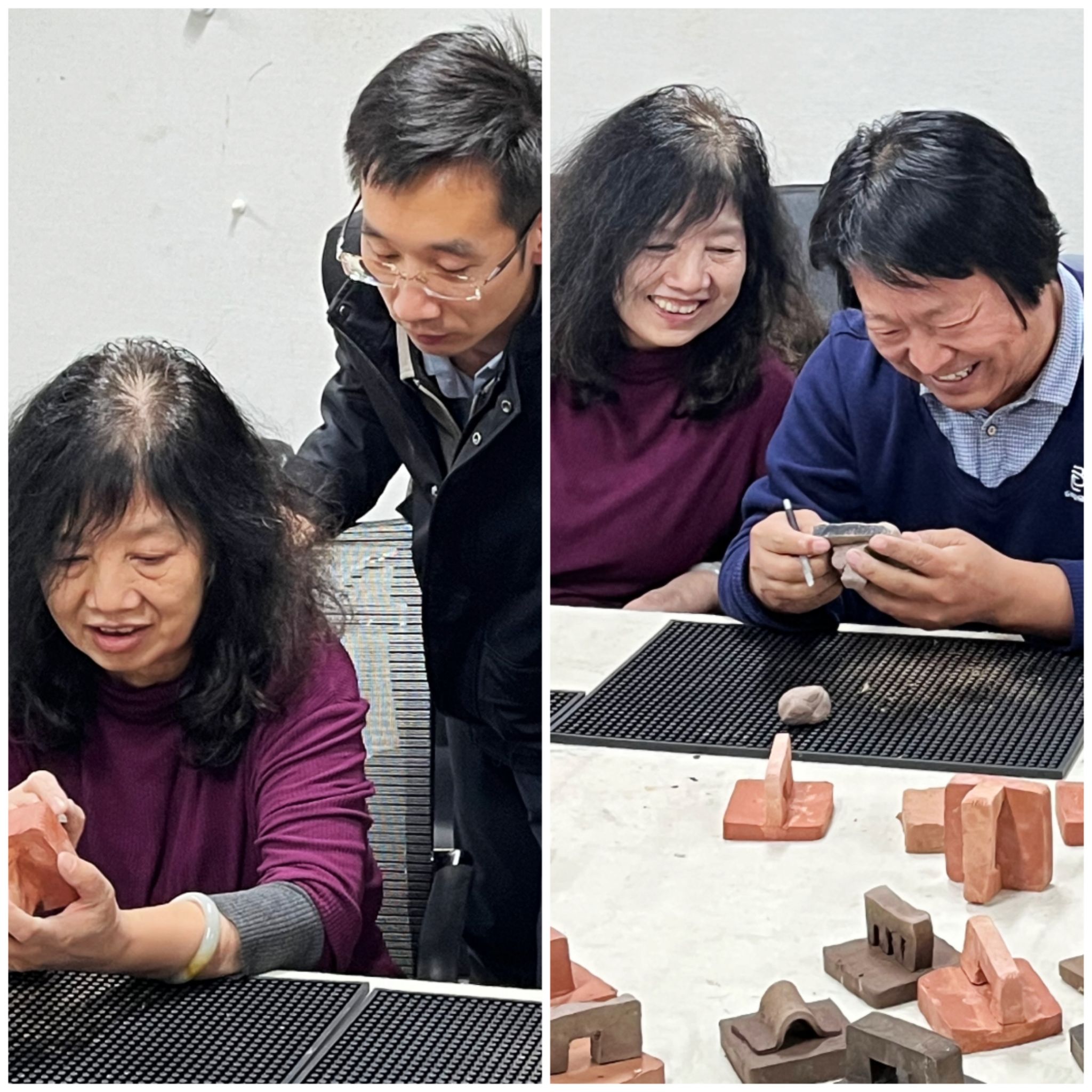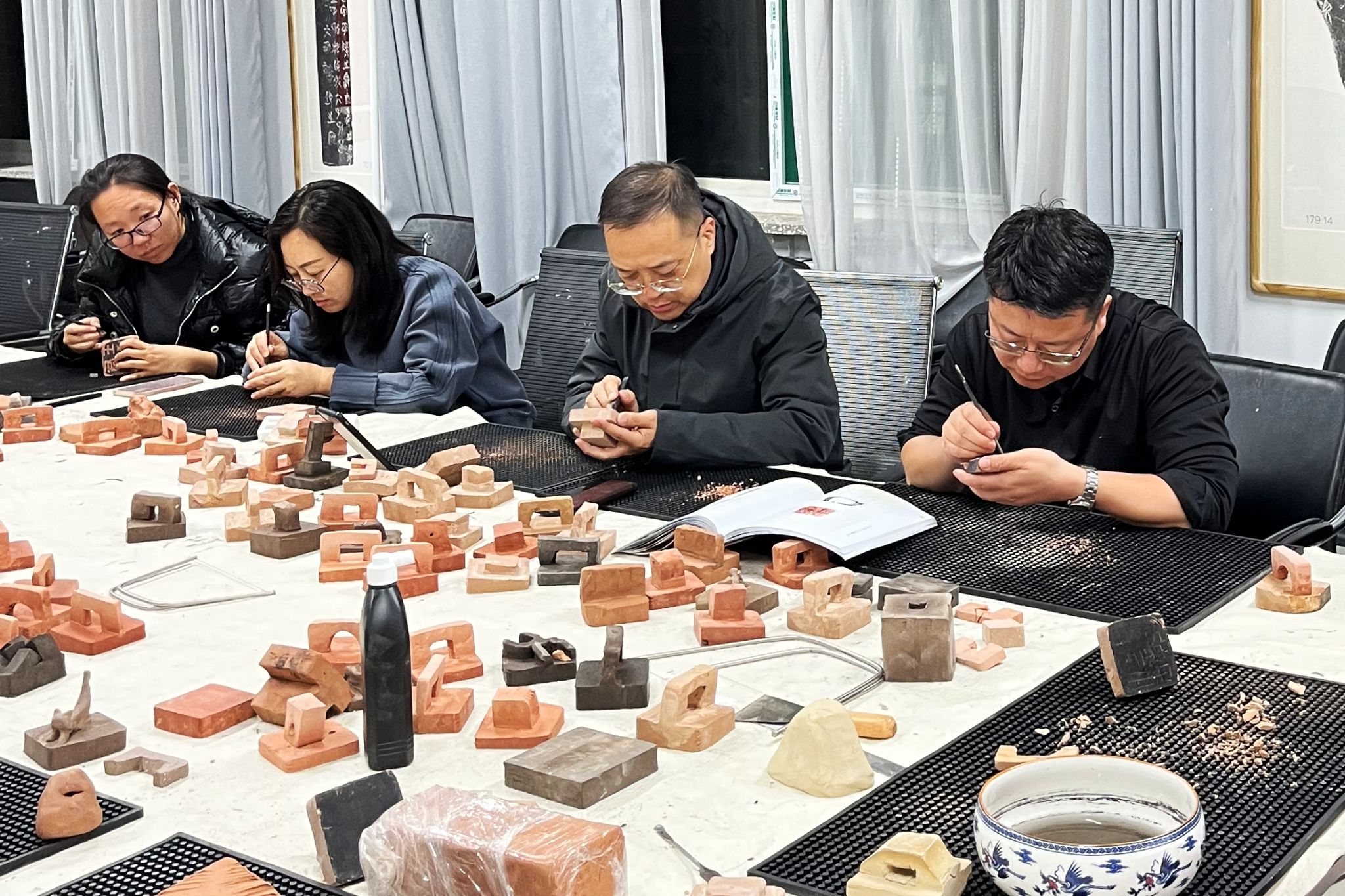 活动伊始,365英国上市公司技法教研室主任王建魁邀请阴凤华老师对陶瓷印的相关知识进行讲解。阴老师结合自己制作的“由土而生”、“窑火唤彩”、“瓷光初现”、“和敬清寂”、“水墨青花”等系列作品,全面讲解了陶瓷印的发展历史、制印技巧、刊刻流程、烧制工艺等知识。讲解结束后,阴老师现场进行了示范,展示了刊刻技巧、说明了设计理念。随后,老师们在拿到事先素烧过的瓷印泥块后,先进行印纽的设计雕刻及印面打磨,之后根据所刻文字内容,进行或阴或阳的刻制,阴老师全程进行了辅导。