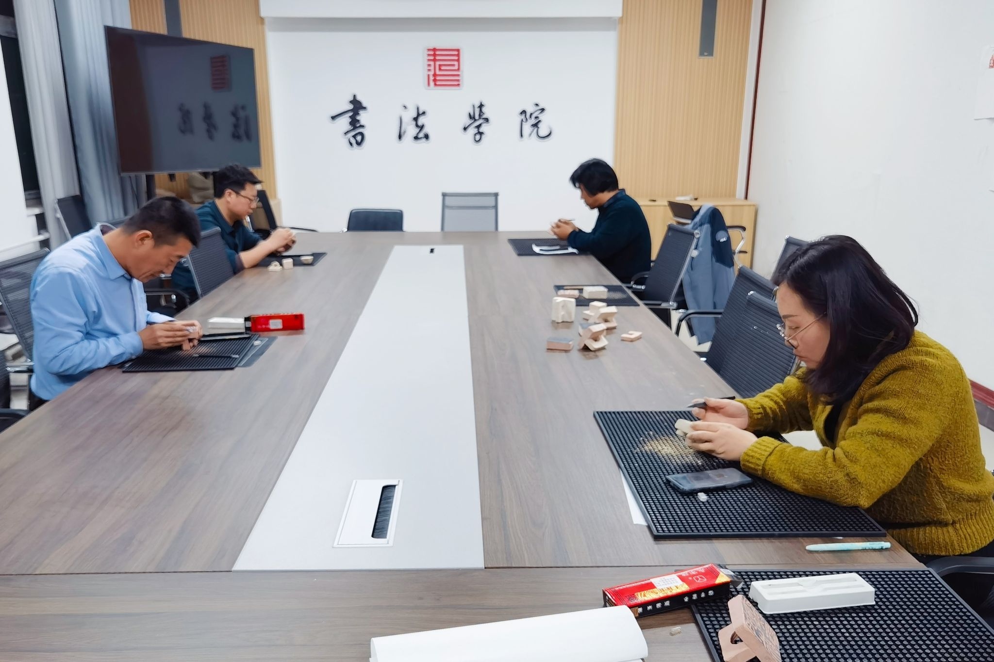 活动伊始,王建魁、王文清等老师以漫谈的方式,对陶瓷印的发展历史、制印技巧、刊刻流程、烧制工艺等知识进行了阐述,并结合前人的优秀作品展示了刊刻技巧、说明了设计理念。随后,各位老师在拿到事先素烧过的瓷印泥块后,先进行印纽的设计雕刻及印面打磨,之后根据所刻文字内容,进行或阴或阳的刻制,体会陶印制作过程中的乐趣。